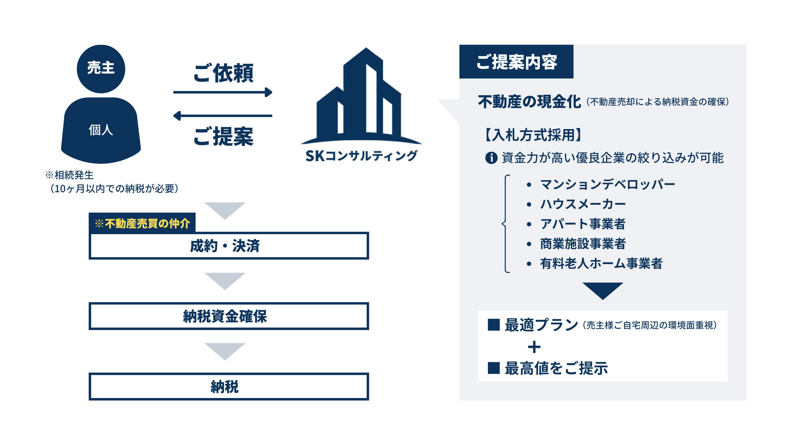 当社の強みである、ネットワーク・既存ルートを最大限に活かし、余裕をもって購入できる買主様をご紹介し、納税期日内に無事に決済までお導きいたします。